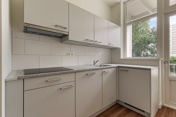 De gloednieuwe L-vormige keuken met inbouwapparatuur zoals een koelkast, vaatwasser en inductie kookplaat met afzuigkap. Van hieruit heb je toegang tot het balkon aan de achterkant. Dit is een fijne plek om van de warmere zomermaanden te genieten.