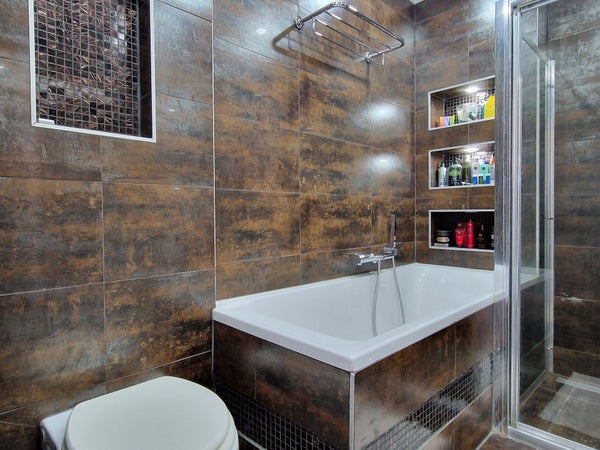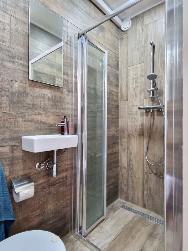 Aangrenzend aan de gang een ruim modern 2de toilet met een kleine douche.