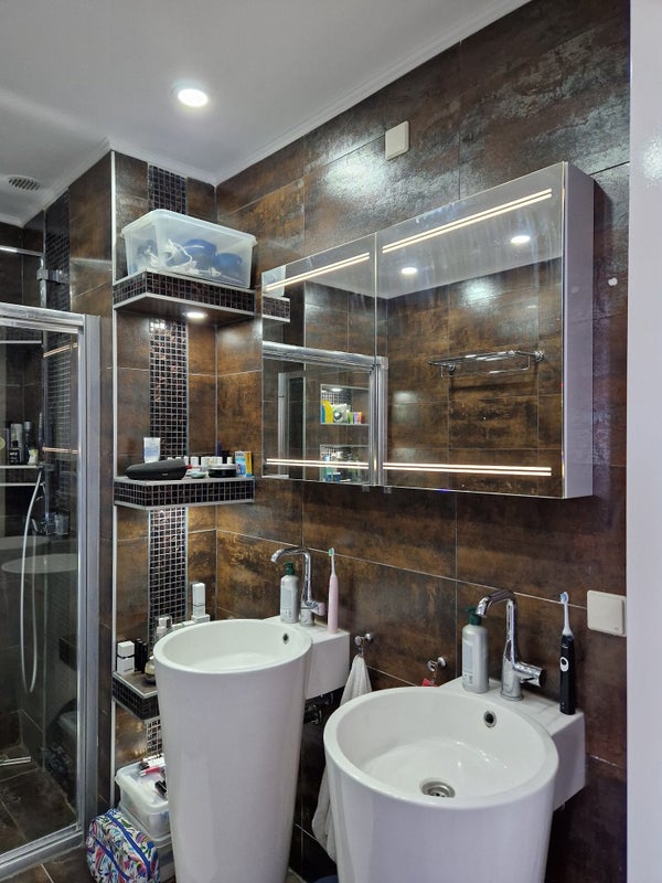 De moderne badkamer (2.50x.2.20m) is voorzien 2 losstaande wasbakken, toilet (sanibroyeur) ruim bad en separate douche
