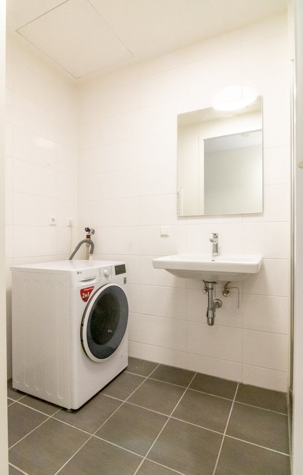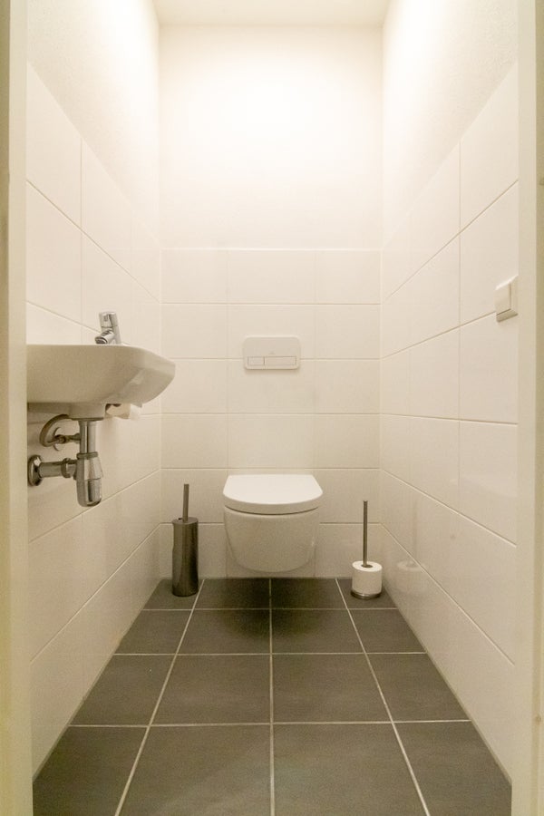The luxurious bathroom has a washtub and a walk-in (rain) shower, and the washing machine and dryer combination is also located here. The separate toilet is equipped with a fountain.