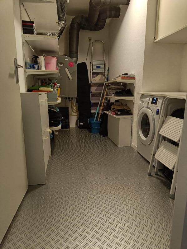 Ruime berging met wasmachine, losse vriezer en veel opbergruimte.