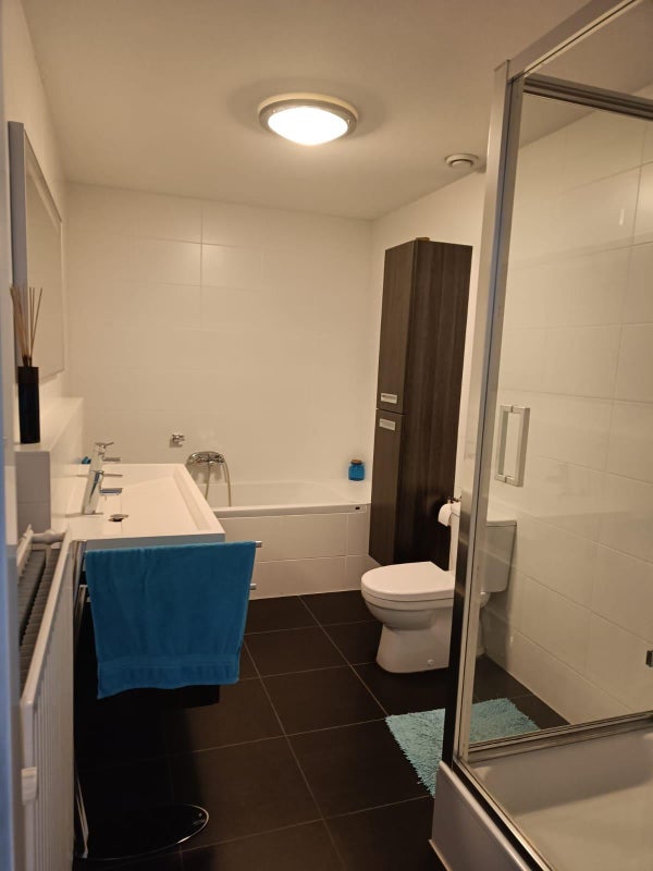 Heerlijke badkamer met douche, bad, dubbele wastafel en tweede toilet.