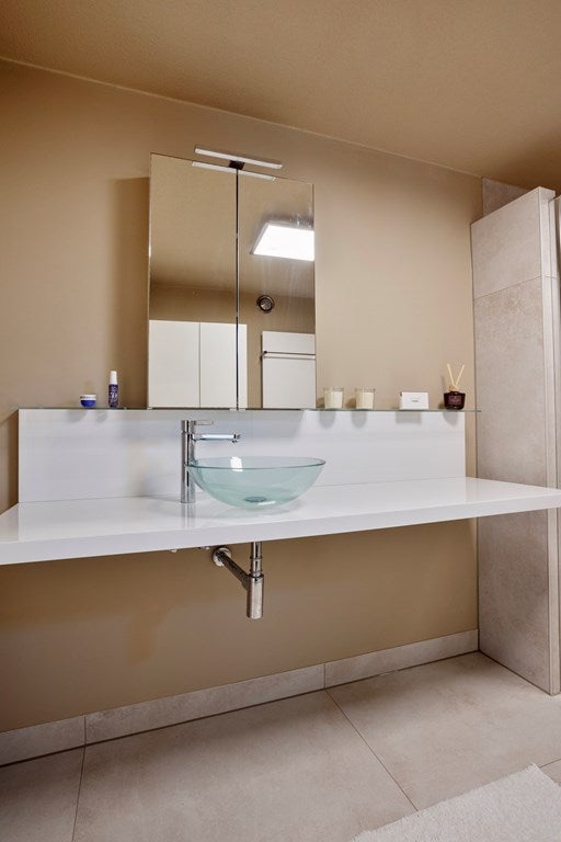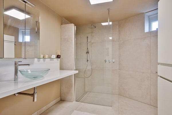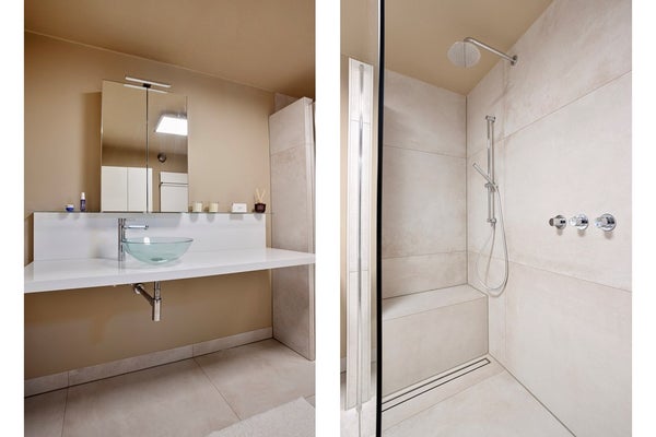 De badkamer is onlangs gerenoveerd en modern, een echte plek om te ontspannen. Het beschikt over een grote wastafel met een genereuze spiegel en opslag voor al je persoonlijke spullen. De ruime inloopdouche heeft een zithoek, regendouche en handdouche, waardoor elke douchebeurt een luxe ervaring is.