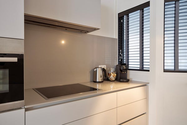 De luxe open keuken is totaal nieuw en voorzien van alle moderne gemakken: inbouwoven, kookplaat, afzuigkap, vaatwasser, koelkast, vriezer en gootsteen. Met veel aanrechtblad en opslagruimte is het een droom voor iedereen die van koken houdt.