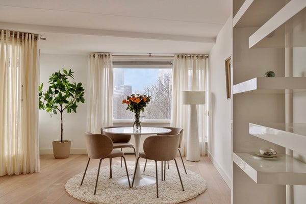 Achterin het appartement word je begroet door prachtig uitzicht over de Maasboulevard. De woonkamer is licht en ruim, dankzij grote ramen, en is smaakvol gemeubileerd met een eetruimte, TV-hoek en extra opslag, wat een warme en uitnodigende sfeer creëert. Vanuit de woonkamer heb je toegang tot het balkon, dat spectaculaire uitzichten biedt op de Maas en de skyline van Rotterdam, een perfecte plek om je dag te beginnen met een kopje koffie of 's avonds te ontspannen met een drankje terwijl je van het uitzicht geniet.