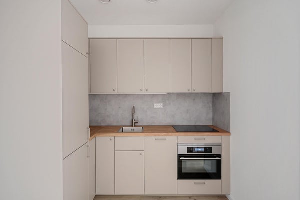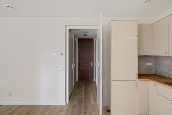 Bij binnenkomst in het appartement word je verwelkomd in een heldere woonkamer die wordt versterkt door grote ramen die veel natuurlijk licht en indrukwekkende uitzichten over de stad op de 14e verdieping bieden. De indeling is efficiënt ontworpen om de ruimte te maximaliseren, met een comfortabele ruimte voor zowel ontspannen als dineren. De keuken sluit naadloos aan op de woonruimte, wat een praktische en open sfeer creëert. De slaapkamer is goed proportioneel en geschikt voor een tweepersoonsbed en kast, terwijl de badkamer modern en functioneel is. Over het algemeen biedt het appartement een slimme plattegrond die ideaal is voor hedendaags stadsleven.