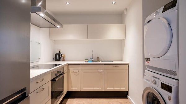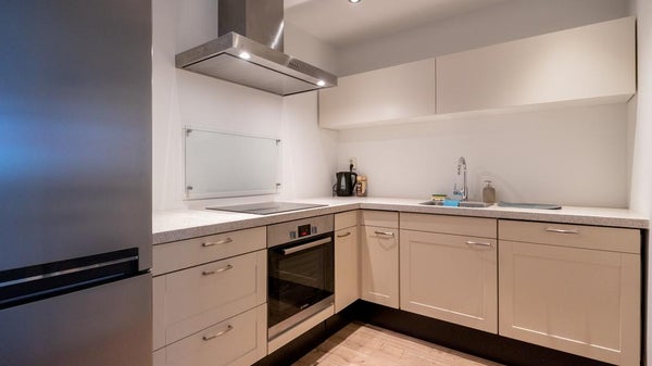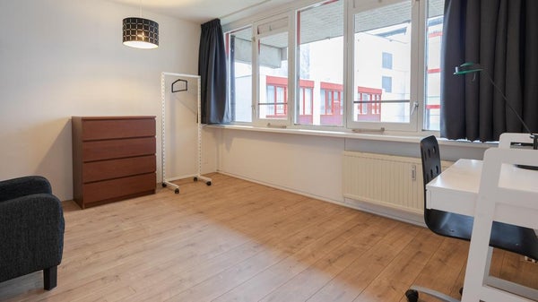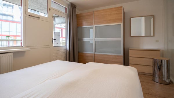 Deze komt uit in de hal waarvandaan een separaat toilet, prettige bergkast en de tweede slaapkamer bereikbaar zijn. Deze slaapkamer kan tevens dienst doen als kantoor en/of logeerkamer. De vaste trap komt uit op de 2e woonlaag van het appartement. Vanaf de overloop is er toegang tot de moderne open keuken welke volledig voorzien is van alle moderne gemakken waaronder een koel- vriescombinatie, vaatwasmachine, kookplaat met afzuiging en was- én droogmachine opstelling. De woonkamer bevindt zich aan de voorzijde en geeft mooi uitzicht over het Schouwburgplein. De overloop geeft toegang tot de prettige en zeer nette badkamer met 2e toilet, wastafel met ladekast, spiegel met verlichting en verwarming en ligbad met douche. De hoofd slaapkamer is aan de achterzijde gelegen en geeft tevens toegang tot het balkon. Dit zeer net afgewerkte appartement is volledig gemeubileerd beschikbaar voor langere termijn en wordt verhuurd inclusief gebruik van privé berging alsmede toegang tot de gezamenlijke fietsenstalling.