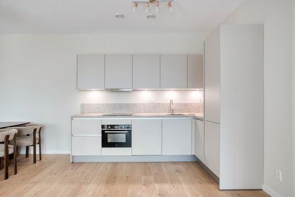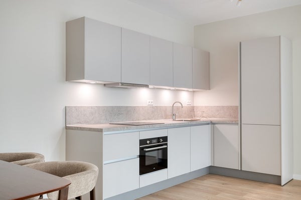 De strakke keuken is volledig uitgerust met inbouwapparatuur, waaronder een combi-oven, inductiekookplaat, koelkast, vriezer en vaatwasser, perfect voor wie graag thuis kookt.