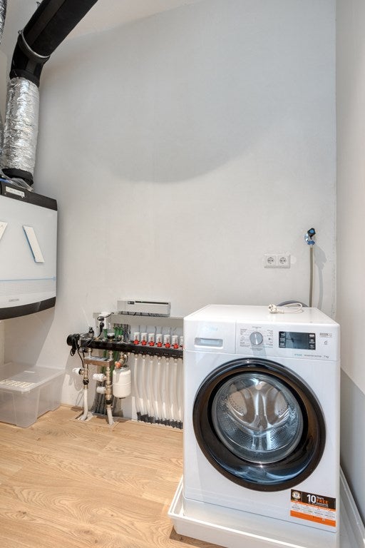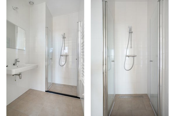 De stijlvolle badkamer is uitgerust met een moderne inloopdouche en een wastafel met spiegel. Daarnaast beschikt het appartement over een interne berging met een wasmachine.