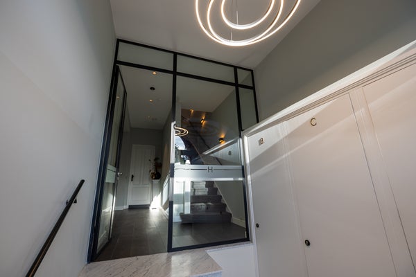 Statige marmeren entree met trap naar de verdieping en toegang tot de lift.