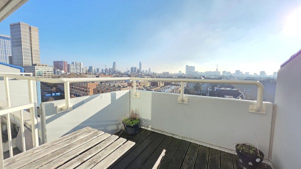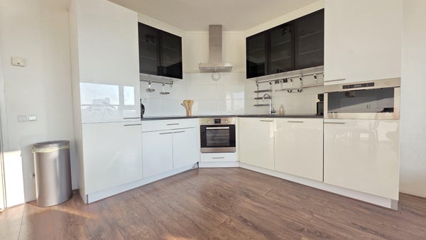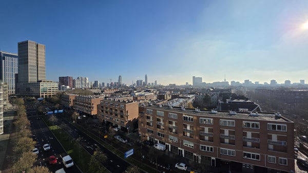 8e verdieping:**Entree appartement, hal met toegang tot alle vertrekken. De ruime woonkamer valt op door de grote ramen, die zorgen voor veel lichtinval en een prachtig uitzicht over de skyline van Rotterdam. Het op het zuiden gelegen balkon is bereikbaar via de woonkamer en biedt een fenomenaal uitzicht! Modern L-vormige keuken voorzien van een keramische kookplaat, afzuigkap, oven, vaatwasser, koelkast, vriezer, magnetron en veel opbergruimte. De ruime slaapkamer ligt aan de rustige achterzijde en geeft toegang tot de praktische wasruimte met was-droogcombinatie. Strakke, frisse badkamer met heerlijke regendouche, brede wastafel, handdoekradiator en toilet.
