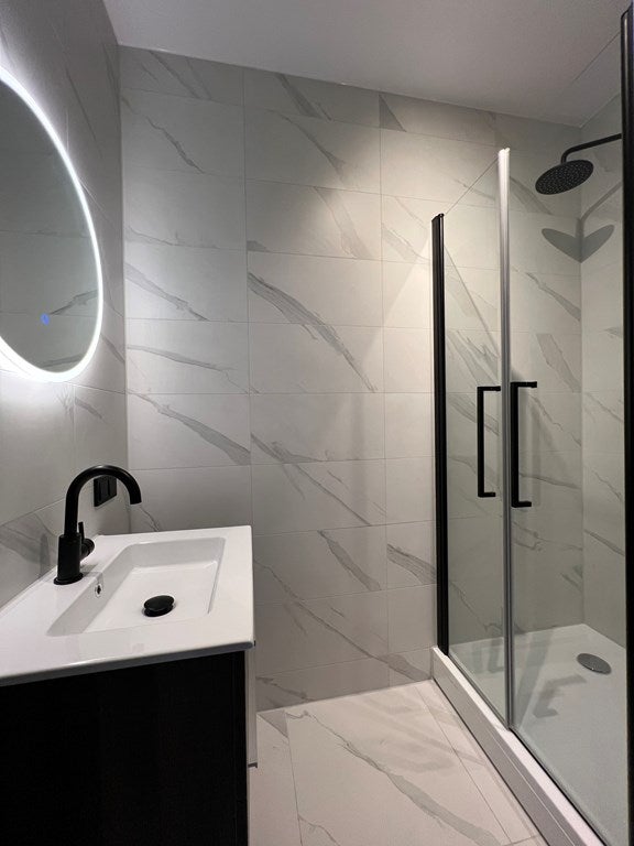 • Voorzieningen badkamer ruime douche, wastafel met meubel en spiegel voorzien van verlichting en een designradiator;