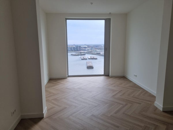 Te huur: Prachtig nieuwbouw appartement op de 16e verdieping met werkelijk fantastisch uitzicht over de Nieuwe Maas. High end afgewerkt met mooie visgraat pvc vloer, luxe woonkamer en badkamer met dubbele douche.