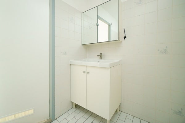 Vanuit de slaapkamer stap je zo de badkamer in, voorzien van een wastafel, spiegel, ligbad met douche en nette afwerking.