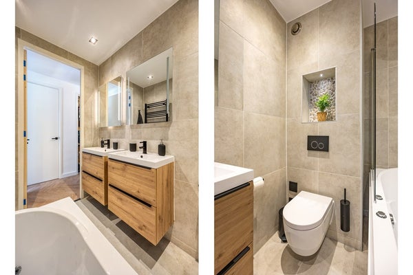De onlangs gerenoveerde badkamer beschikt over een bad met regendouche, toilet en dubbele wastafel met dubbele LED-verlichtingsspiegel.