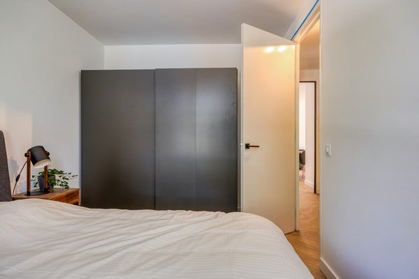 De ruime slaapkamer ligt aan de rustige kant van het appartement en heeft een splinternieuw tweepersoonsbed met een ruime kast.