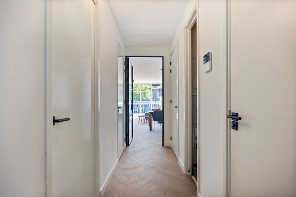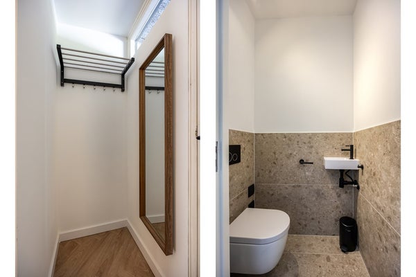 Je komt binnen via een ruime hal met toegang tot het ruime en splinternieuwe toilet met wastafel, de meterkast, en een praktische opslagkast.