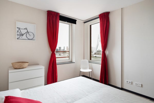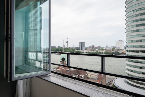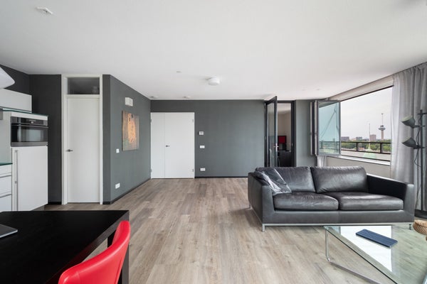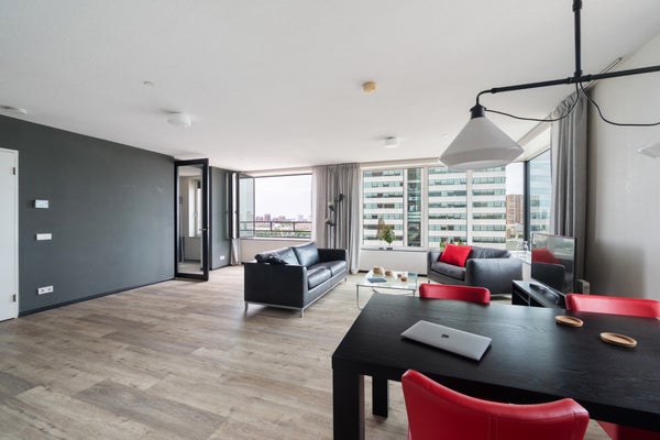 Indeling:De woontoren 'Montevideo' heeft een afgesloten entree met brievenbussen en toegang tot de berging en parkeerplaats. Entree naar het appartement op de 11de verdieping van het gebouw. Ruime hal met toilet en toegang tot de berging. Royale woonkamer met luxe open Siematic keuken, welke beschikt over vaatwasmachine, kookplaat, afzuigkap, combi oven en spoelbak. Slaapkamer met tweepersoonbed en gardarobekast. De badkamer beschikt over een bad, twee wastafels, een tweede toilet en een douchecabine. Tweede slaapkamer, nu in gebruik als studeerruimte. De tweede slaapkamer kan eventueel aangevuld worden met een slaapbank.Parkeerplaats te huur voor €200 per maandDe borg is gelijk aan 2 maanden€280 additioneel voor entree Gym, sauna en zwembad