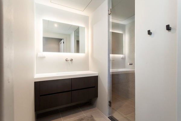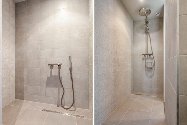 Elk appartement heeft 2 badkamers met regendouche. Een was/droogmachine is ingebouwd in een kast.