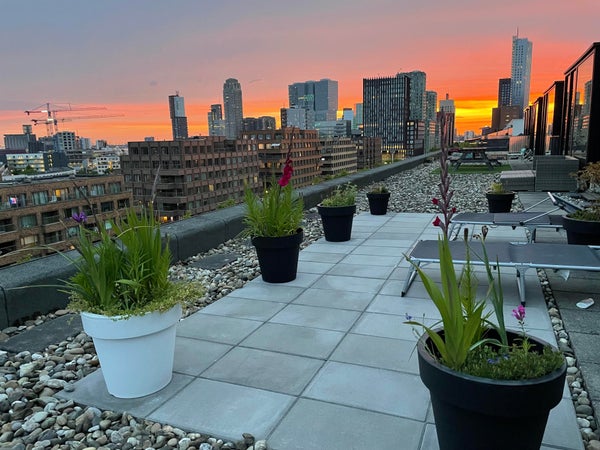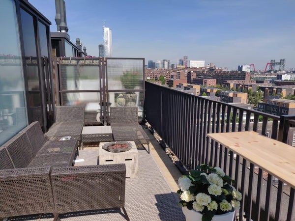 De bovenverdieping is bereikbaar via een trap, die leidt naar een ruime en charmante slaapkamer. Deze kamer biedt toegang tot het dakterras, de ware hoogtepunten van deze woning. Het terras is ontworpen zodat je gedurende de dag van zonlicht kunt genieten, met voldoende schaduwrijke plekken als dat nodig is. Het uitzicht op de skyline van Rotterdam is werkelijk adembenemend, vooral op zomeravonden.