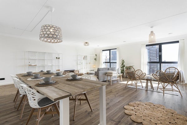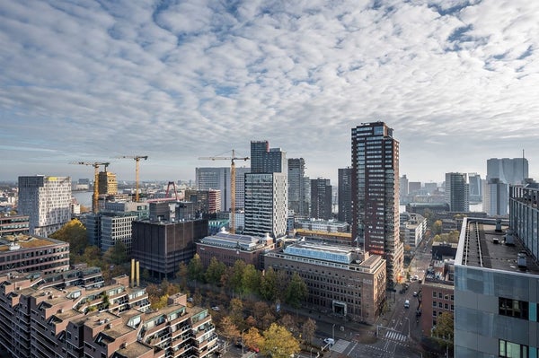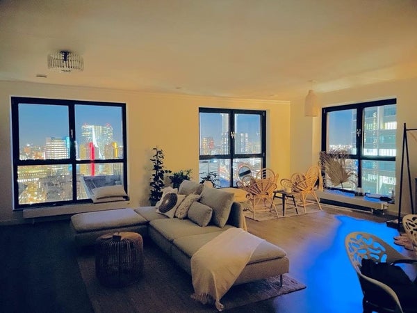De woonkamer beschikt door de gigantische raampartijen over een fantastisch uitzicht over de binnenstad van Rotterdam.