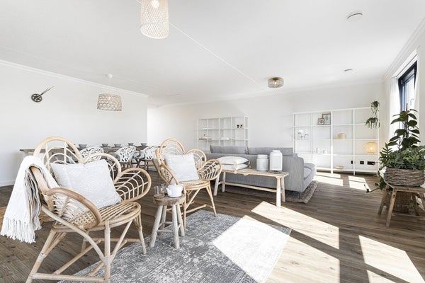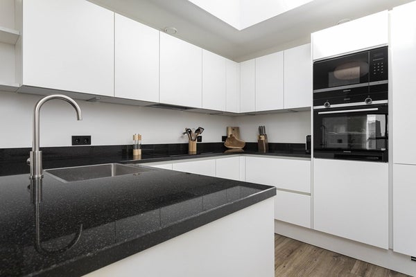 De moderne open keuken met bar is van alle gemakken voorzien en beschikt over diverse inbouwapparatuur zoals een combi-oven, vaatwasmachine, koelkast met aparte vriezer en inductiekookplaat met afzuigkap.