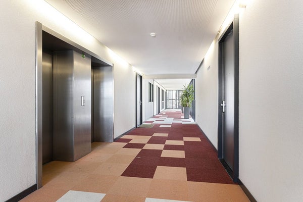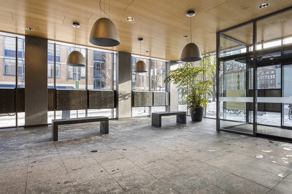 Binnenkomst in afgesloten entree met mailboxen, trappenhuis en liften.