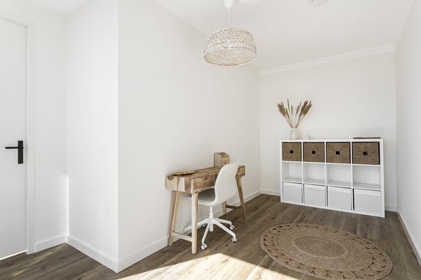 Vanuit de hal is ook de derde slaap/werkkamer gelegen. Deze ruimte is uitermate geschikt als werkruimte of als gastenverblijf. Deze kamer beschikt momenteel over een bureau en boeken/opbergkast.