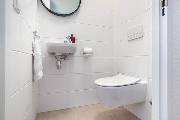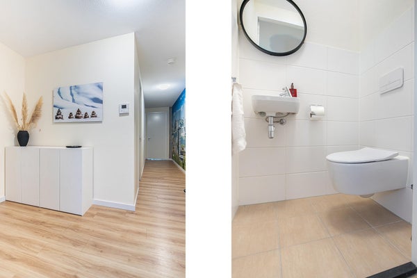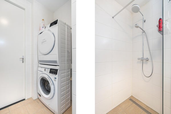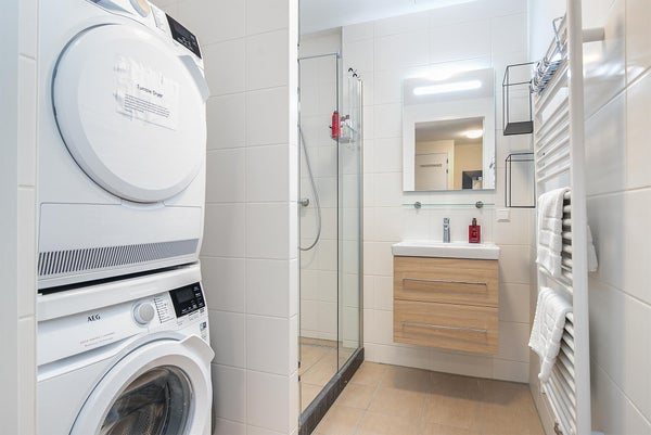 De moderne badkamer is uitgerust met een regendouche, wastafelmeubel met spiegelverlichting, designradiator en een was-/droogcombinatie.