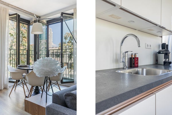 De open keuken is strak vormgegeven in wit en voorzien van hoogwaardige inbouwapparatuur: inductiekookplaat, combi-oven, vaatwasser en afzuigkap.