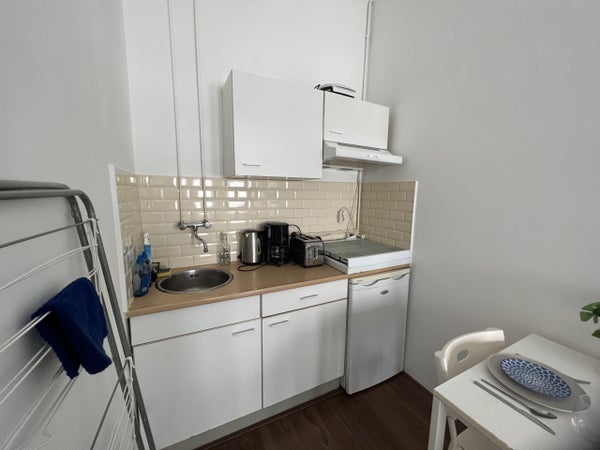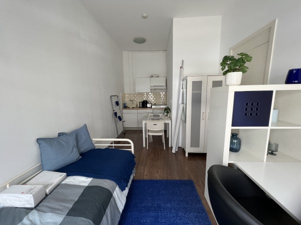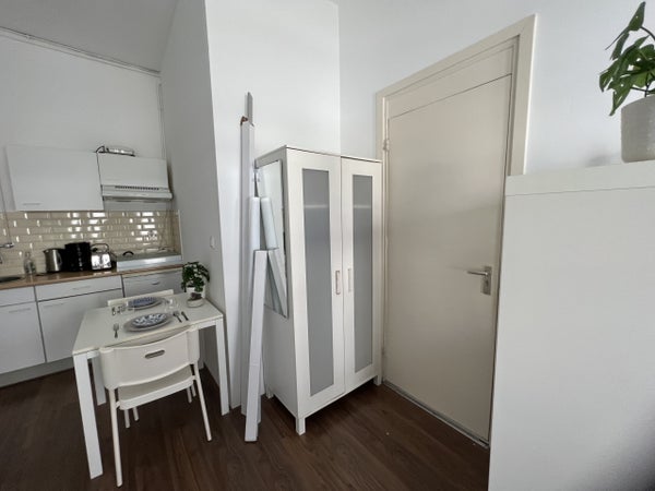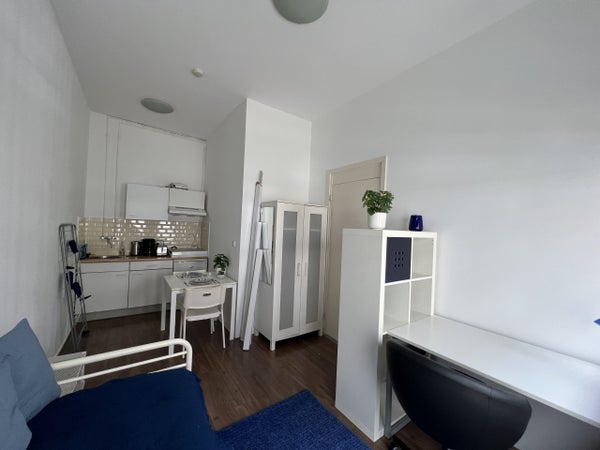 Indeling: Gezamenlijke entree met toegang tot de studio aan de voorzijde van het pand. De kamer is ingericht met een eenpersoonsbed, bureau en kledingkast. De eigen keuken is voorzien van een aanrechtblok, gaskookplaat en koelkast. De onlangs gerenoveerde gedeelde badkamer is uitgerust met een toilet, wastafel en douche. De wasmachine is eveneens gedeeld en bevindt zich in de hal.