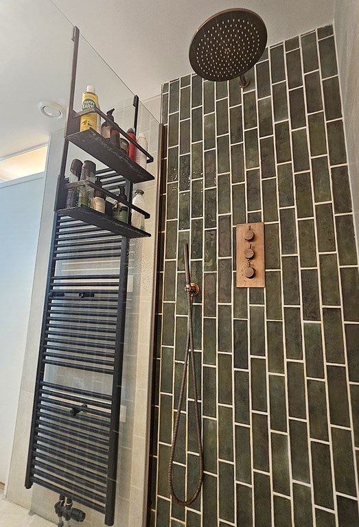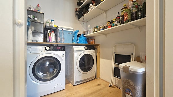 De luxe badkamer straalt rust en kwaliteit uit, voorzien van een ruime inloop regendouche en een strak vormgegeven wastafelmeubel. Daarnaast is er een separaat toilet en een aparte wasruimte met wasmachine en droger.