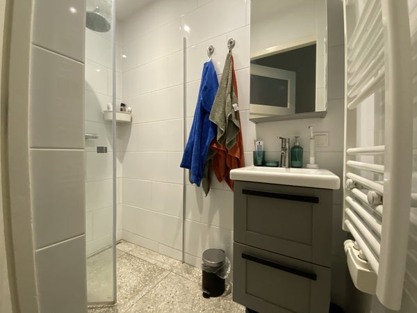 De luxe badkamer is voorzien van een douche met regendouche, wastafel met ondergelegen lades, spiegel met verlichting en handdoekradiator.