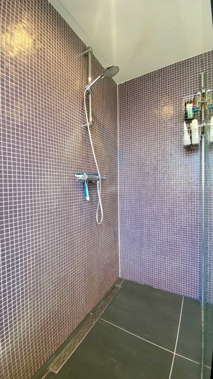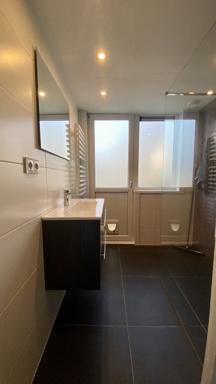 - Badkamer met douche, wastafel en toegang tot het ruime balkon