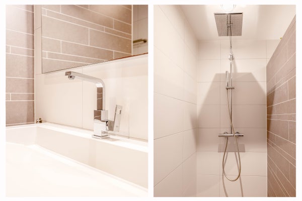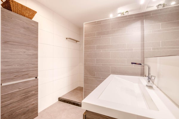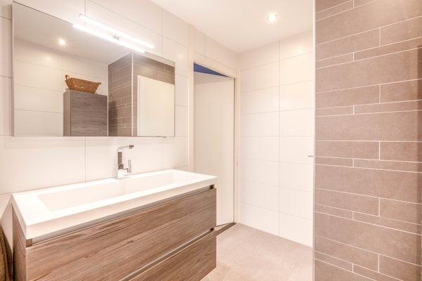 Via de ruime hal zijn de drie slaapkamers, de badkamer en het separate toilet bereikbaar. De badkamer is modern afgewerkt en voorzien van een inloopdouche, wastafelmeubel en aansluiting voor wasmachine en droger.