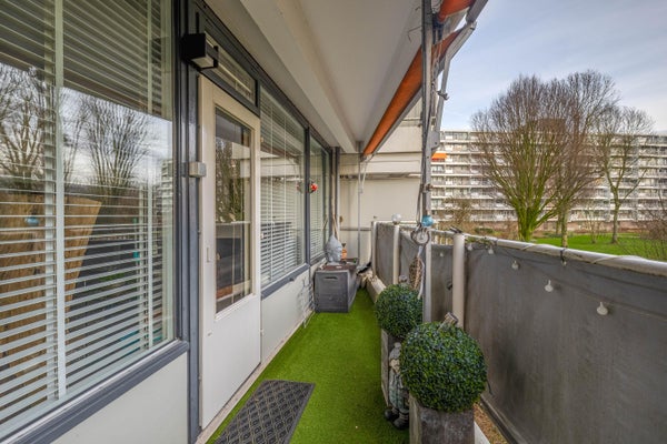 Aan de achterzijde bevindt zich het zonnige balkon, gelegen op het zuiden. Door het aanwezige zonnescherm is er ook schaduw te creëren.