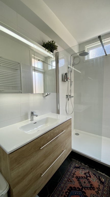 optrap naar de eerste etage, slaapkamer 1, slaapkamer 2 met openslaande deuren naar het balkon, badkamer met badkamer meubel, douche design radiator, wasmachine en droger en een aparte WC.