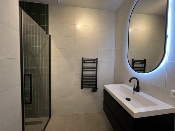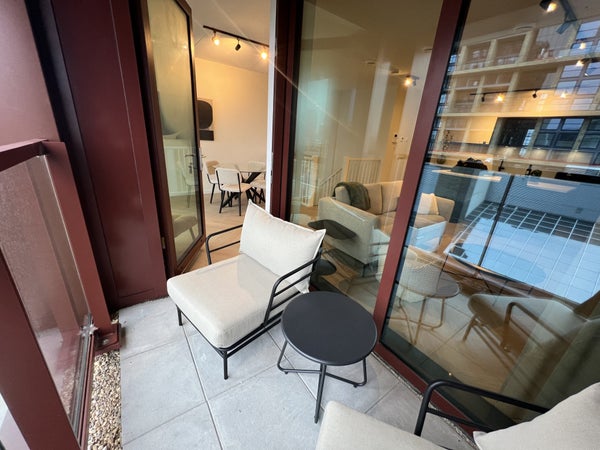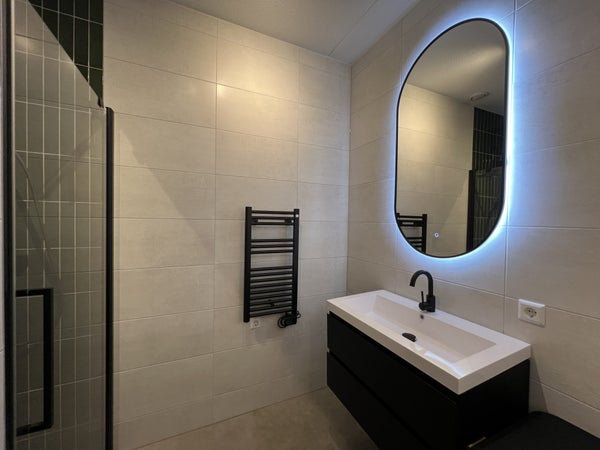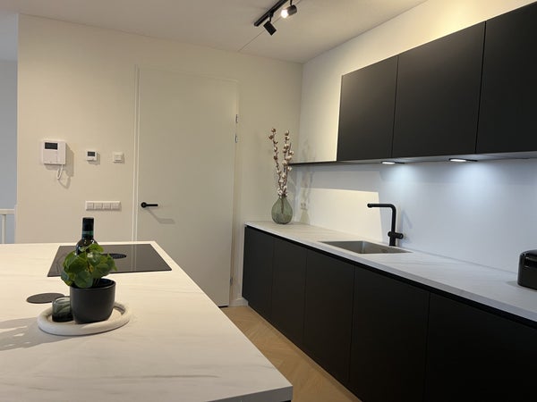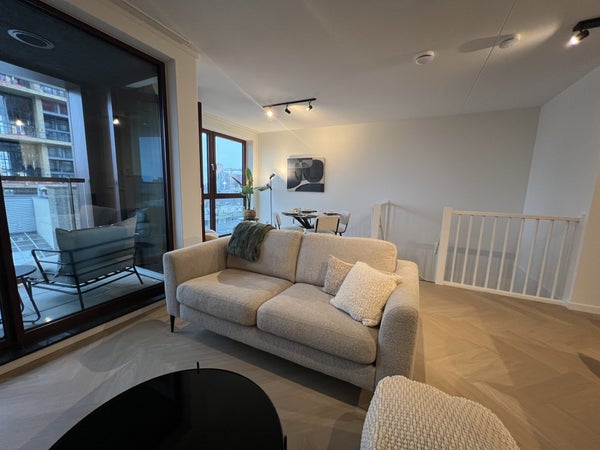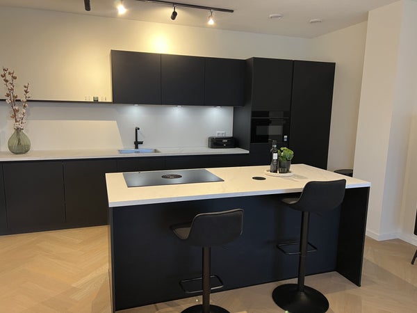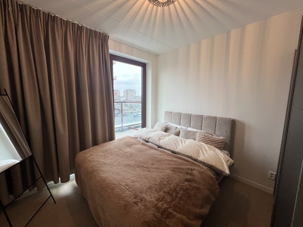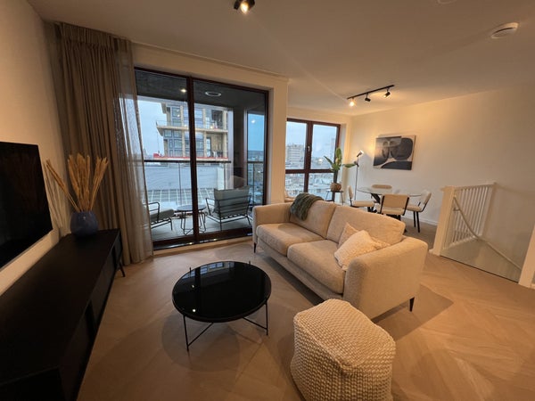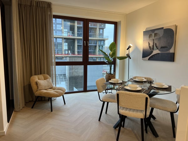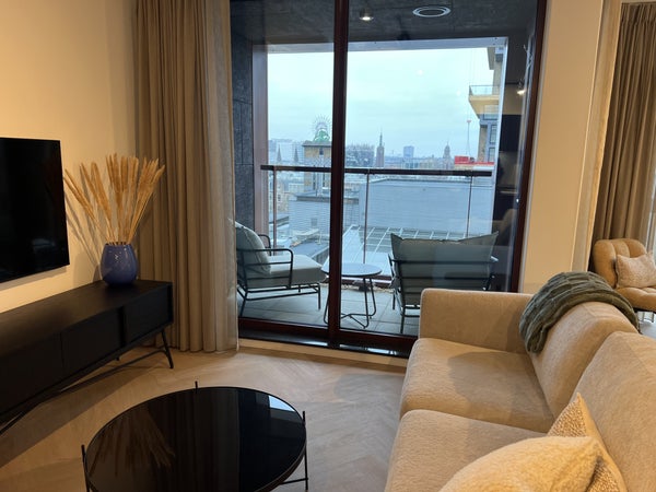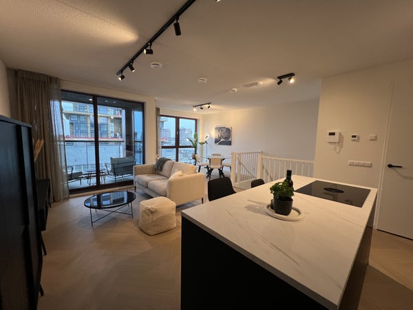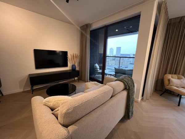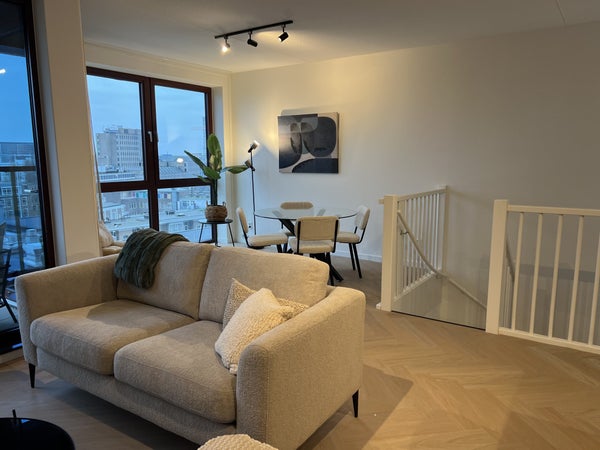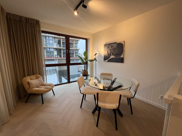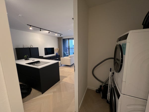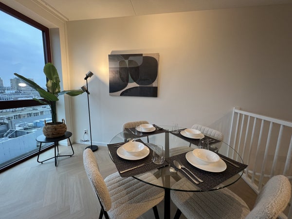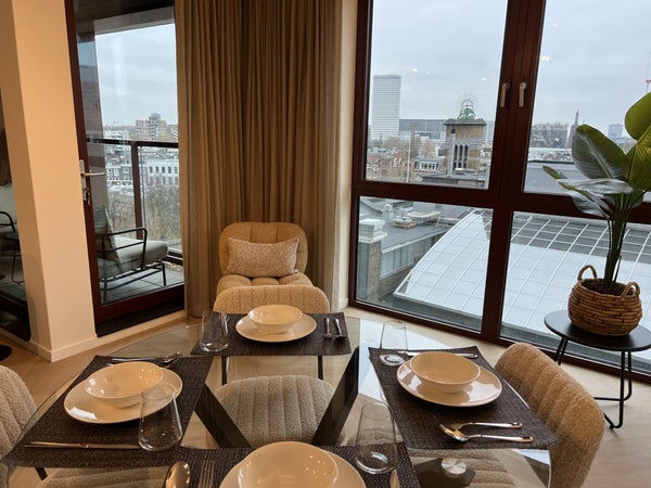 handdoekradiator, wastafel met meubel en spiegel met verlichting.Daarnaast is er separaat hangend toilet met wastafel.8e verdiepingTrap omhoog naar de woonkamer met open keuken, eetkamer en zithoek.De ruime eethoek heeft een ronde glazen tafel met 4 teddy stoelen, ideaal voor gezellig dineren. De zithoek is voorzien van een matchende, comfortabele tweepersoons teddy bank, salontafel, tv-meubel en tv.De open keuken is uitgerust met zwarte kastjes, Siemens combi-oven, Siemens vaatwasser, een Bora afzuigsysteem, koelkast, vriezer, kookeiland en zitbar.Er is ook een handige opbergruimte naast de keuken, welke voorzien is van een Siemens wasmachine en droger.Het 2e balkon is toegankelijk vanuit de woonkamer, met een gezellige zitplek en ideaal voor het genieten van de avondzon.Er is ook een gezamenlijk dakterras op de 7e verdieping en een ruime gezamenlijke fietsenberging op de begane grond. Het is mogelijk om een aparte parkeerplaats te huren.