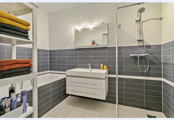 De badkamer is uitgevoerd met een combinatie van grijze en witte tegels en beschikt over een ligbad, inloopdouche en wastafelmeubel. Verder is er een separaat is er een toilet aanwezig en een praktische berging met wasmachineaansluiting.