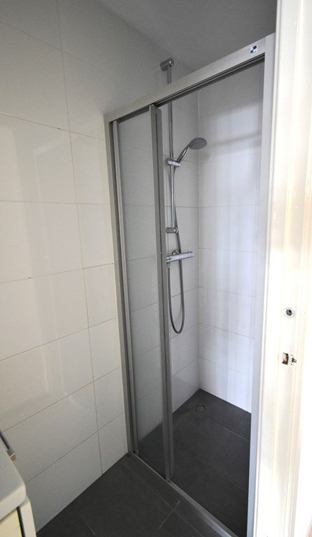 De badkamer is voorzien van een douche en een wastafelmeubel met spiegel.