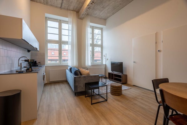Bij dit appartement zijn zoveel mogelijk de oude details behouden. Je stapt binnen in de woonkamer met een open keuken. De keuken is voorzien van moderne apparatuur, waaronder een combimagnetron en vaatwasser. Het appartement heeft een slaapkamer met een tweepersoonsbed en kledingkasten.
