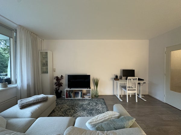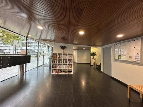Indeling Begane grond De begane grond beschikt over een gezamenlijke entree met bellentableau, postbussen, een zitplek en een informatiebord. Met de liften of trap bereik je de galerij op de eerste verdieping die leidt naar de entree van het appartement. 1e verdieping Je komt binnen in een hal die toegang geeft tot alle vertrekken. Aan de achterzijde bevindt zich de ruime woonkamer met grote raampartijen die uitkijken op het groen. De ruimte is ingericht met een comfortabele zitbank, tv-meubel met televisie, bureau, een eettafel en een interne bergkast.