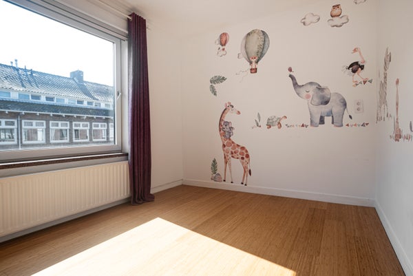 De eerste slaapkamer is gelegen naast de woonkamer aan de voorzijde van de woning. Deze kamer biedt voldoende ruimte voor een tweepersoonsbed en een ruime wandkast. Deze kamer beschikt tevens over een ruime inbouwkast annex bergruimte. De in de presentatie getoonde stickers op de muren zijn verwijderd en de muren zijn recent geschilderd.