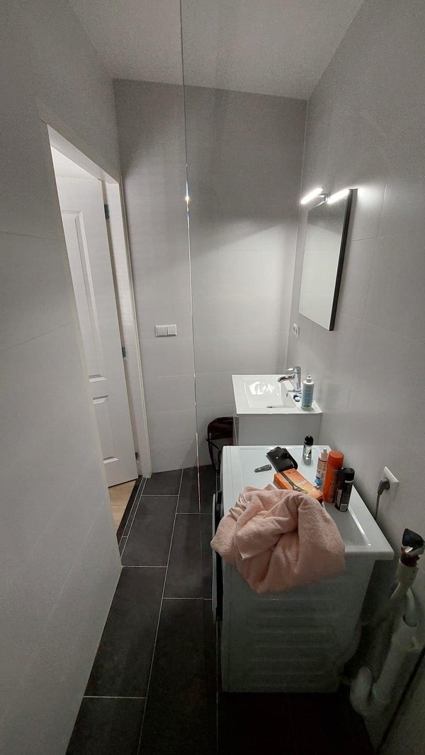 badkamer met inloopdouche, wastafel en wasmachine. Toilet is apart.