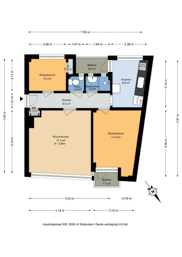 Het is een 3-kamer appartement met 1 grotere en 1 kleinere slaapkamer. Naast de woonkamer en aparte keuken zijn er twee balkons aanwezig en een externe berging in de onderbouw. De keuken is voorzien van een kookplaat, afzuigkap, ijskast en wasmachine. Ook is er een apart toilet in de gang.