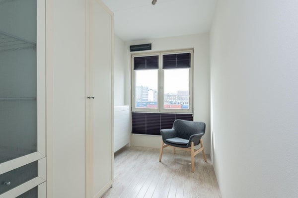 Hal. Toilet met fonteintje. Vanuit de hal is er toegang tot de lichte woonkamer aan de voorzijde met zijn grandioze uitzicht over de Maashaven. Aan de achterzijde van de woonkamer is de half open keuken met voornamelijk SIEMENS-inbouwapparatuur gelegen. Vanuit de keuken is er tevens toegang tot het balkon. Dit balkon is daarnaast ook te betreden vanuit de hal.
