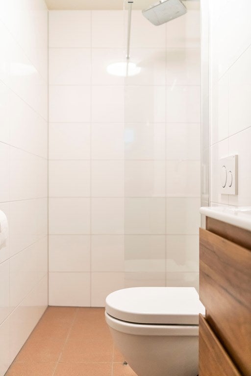 In de ruime badkamer vind je een inloop regendouche, wastafel met spiegel en handdoekradiator. Het toilet is gescheiden van de badkamer en heeft een klein wastafeltje. Via de hal kun je de interne berging bereiken waar de was/droog combinatie zich bevindt.