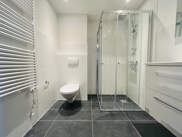 LAY-OUT: Entrance at street level, you enter the communal area. You take the stairs to the 1st floor where the apartment is located. Front door, entrance directly into the L-shaped living room of approx. 34 m². Open L-shaped kitchen equipped with a hob, refrigerator, freezer, extractor hood, dishwasher, and microwave. Two bedrooms located at the rear, of approx. 11 m² and approx. 8 m². From the bedrooms, you have access to the lovely balcony. Bathroom fitted with a shower, toilet, and washbasin.