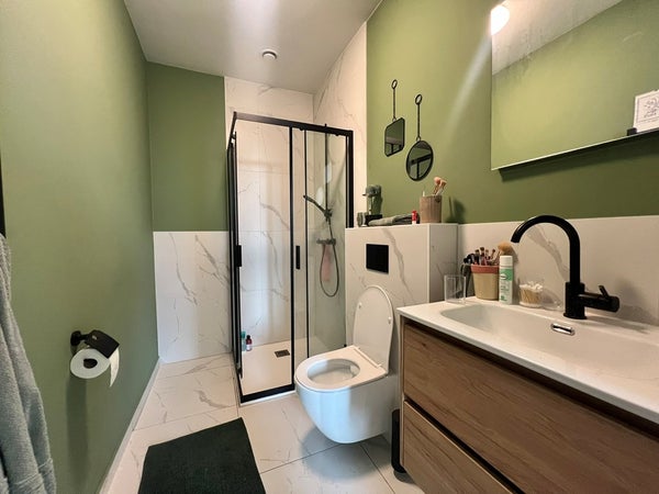 De badkamer is voorzien van een douche, een wastafelmeubel met spiegel en een toilet.