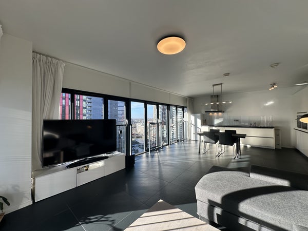 De lichte en ruime woonkamer is voorzien van grote ramen en biedt een prachtig panoramisch uitzicht over de stad. De moderne open keuken is uitgerust met hoogwaardige inbouwapparatuur en biedt veel werk- en opbergruimte.Slaapkamers: